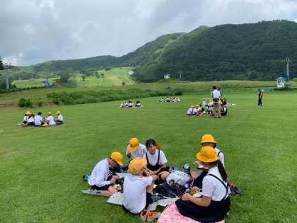 朝早くの集合でさぞかし、お腹もすいたことでしょう。青空のもとの昼食は、お弁当です。グループになって、林間1回目の食事タイムです。