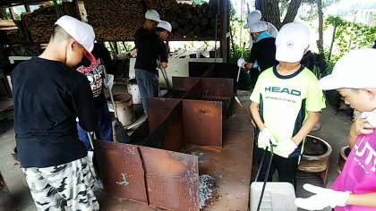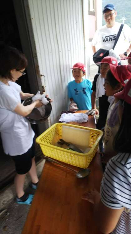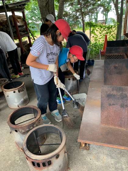 美味しくいただいた後は、後片付けです。使う前より美しく!を合言葉に、丁寧に一つひとつ洗います。まきを使ったので、お鍋の底はのすすは、なかなか取れません。力をこめてごしごしと洗い、ぴかぴかになりました。片づけが終わるころ、雨が降り出しました。午後からの活動に支障がなければよいのですが…