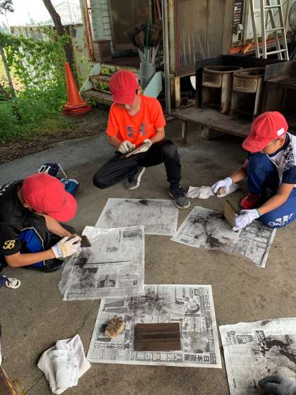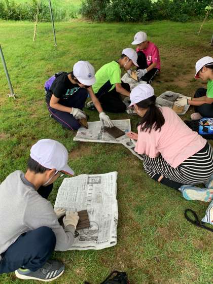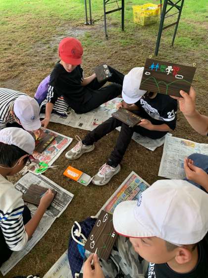 焼き板は、一生けん命こすると、つやつやになります。そこに思い思いの色で絵や文章を書きます。ハチ高原での楽しい思い出を描いているのでしょうか。どんな出来になるかは、帰ってからのお楽しみです。