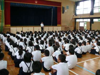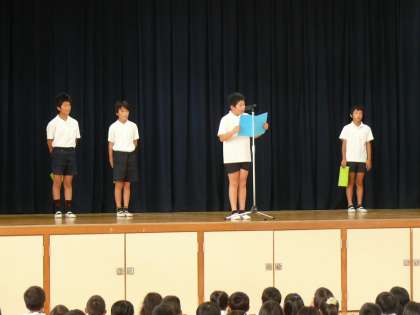 8時50分から約30分間、講堂で1学期終業式を行いました。まず、私の方から「一人ひとりみんなにはいいところがある。自信をもってがんばることができたか」「夏休みしなければならないことは早い目に済まそう」等話をしました。その後、5・6年の児童4人が1学期をふりかえって、そして夏休み、2学期にがんばりたいことをみんなの前で発表しました。4人とも緊張したでしょうが、イキイキとわかりやすく伝えることができていました。さすが、大東の高学年です。