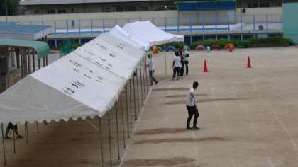 PTAの方々もたくさん手伝いにきていただいて、無事テントをはることができました。ありがとうございました。当日は、暑さ、雨の心配なく、力を発揮してくれることでしょう。