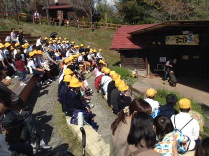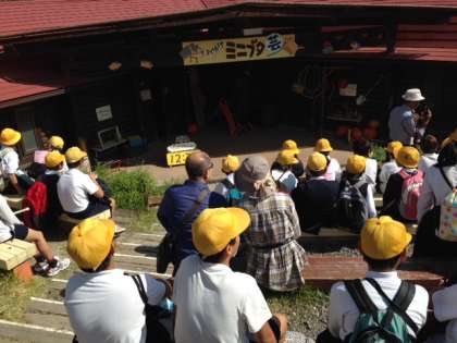 一通りグループ活動を終えて、「ミニぶたショウ」をみんなで見ました。集合を兼ねて集合し、かわいいミニぶたたちのショウを観ました。ミニぶたショウを楽しんだ後は、いよいよ「ソーセージづくり」に挑戦です。
