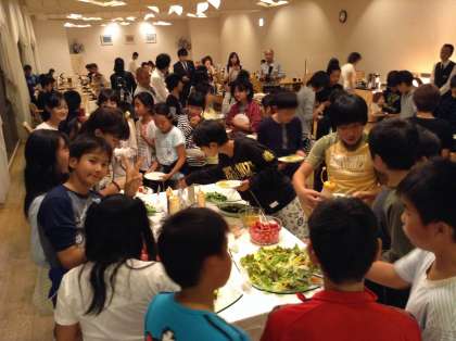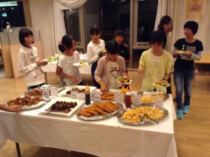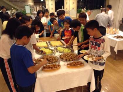 夕食をバイキングでいただきました。食事係のあいさつで1日を振り返り、いただきますをしました。