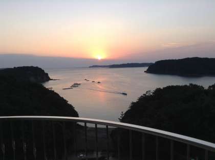 志摩方面の天候は、快晴です。絶好の修学旅行日和です。全員、元気に起床して、ホテルのプライベートビーチに行き、志摩のリアス式海岸の朝焼けを楽しみました。