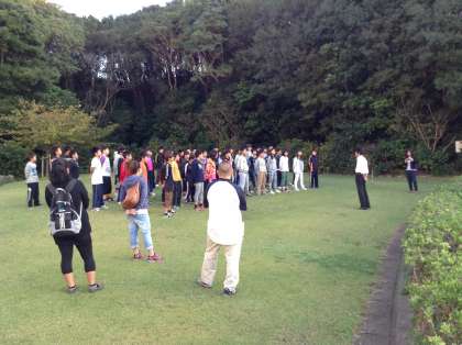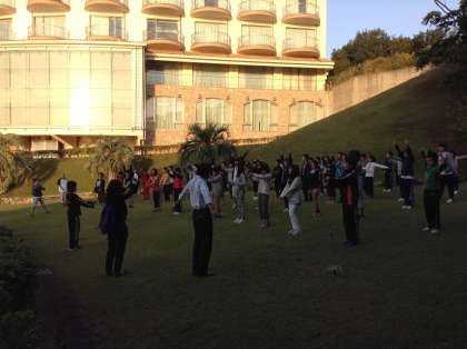 朝の会、体操、記念撮影、朝の散策などをしました。昨晩は、暗くてわからなかったホテルの庭や周辺などを散策して楽しみました。