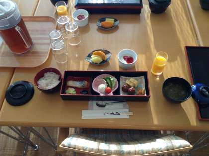 朝の会を行い、身体もばっちり起きたところで、朝食を頂きました。朝は、一人一人用の食事です。