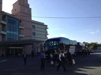 宿舎を出発して、スペイン村に到着。記念撮影をして、ゲート前で待機中です。