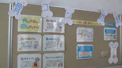 今日は、保健室前にある掲示物の紹介です。みなさんの体には、たくさんの骨があります。運動したり、遊んだりして、骨折をしたことがある人はいませんか?骨折をしないように骨を丈夫にしたり、骨の役割をしっかり知ったりすることで、骨を丈夫にすることができます。保健室前の掲示物をしっかり読んで、骨コツ貯金をしてくださいね。