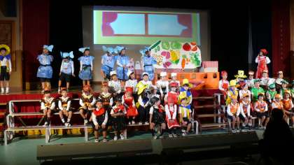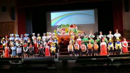 1年生の演技は、「サラダでげんき」(1年生の教科書に掲載、学習しました。)」をオペレッタ風にアレンジして演じています。