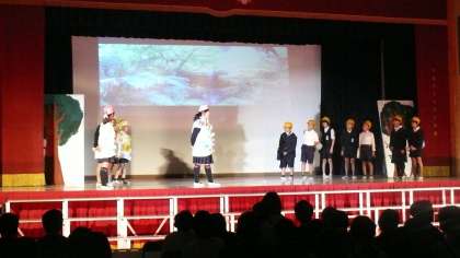 4年生の発表は、「環境教育劇」です。4年生は、社会科の学習で、「水」「ごみ」などについて学んだり社会見学に出かけて、体験や学びをしてきました。