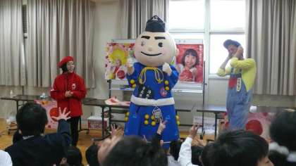 りんごマンがおいしいりんごができるまでを紙芝居でたのしく教えて下さいました。代表の子どもたちがリンゴカッターで皮をむく体験をし、むいたりんごをみんなでおいしくいただきました。りんごマンとの皮むき勝負にかったので、たくさんのお土産をもらうことができ、子どもたちはおおよろこびでした。