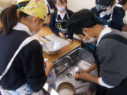 今日は6年生が家庭科の調理実習でサンドイッチを作りました。具はたまご、きゅうり、ハムを入れました。味付けでマヨネーズをどれぐらい入れたらおいしいか班で相談しながら、少しずつ味見をしながら取り組みました。切り方も三角にしてお皿に盛りつける班や四角に切って盛りつける班などいろいろで楽しく調理実習に取り組むことができました。調理をしながら、使い終わったお皿や道具など効率よく後片付けに取り組み、テキパキ行動する姿はさすが6年生!