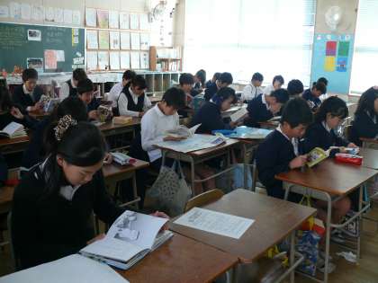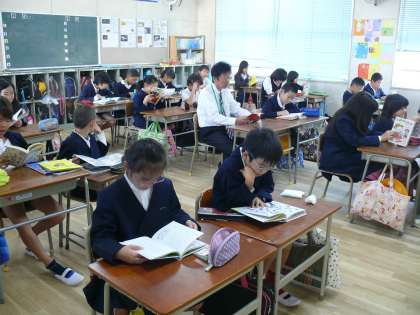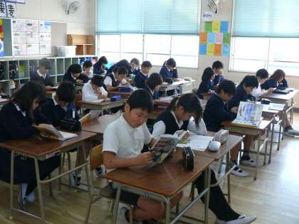 朝のチャイムが鳴ると、一斉に読書タイムで本を読みだします。学校中が静かに読書をしている様子がうかがえます。