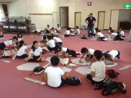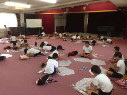 魚を食べて、少し休憩をはさんで、凧づくりをしています。大広間で、涼みながら、思い思いの凧をつくっています。完成したら、高原でおもいっきり凧をあげる予定です。