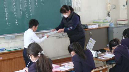 その後、教室で、担任の先生から、通知票を渡されました。一人一人にがんばりについて声をかけてもらったり、1年生では、がんばりメダルを、握手の代わりんかけてもらったりと、無事に1年間を締めくくることができました。コロナウイルス感染症との戦いは続きますが、この1年間学校の教育活動にご理解とご協力をいただきまことにありがとうございました。