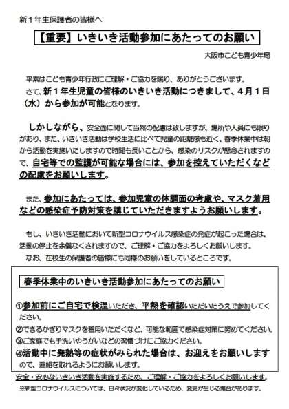 新1年生の保護者の方へのいきいき活動のお知らせ(3月26日) 公開日 2020/03/26 更新日 2020/03/26 お知らせ いきいき活動について、新1年生の保護者の皆様絵へのお知らせです。 いいね(0)
