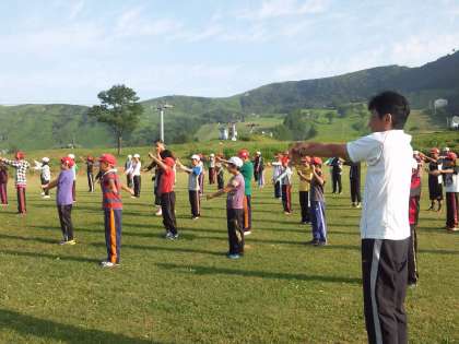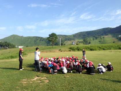 夜もぐっすり眠り、さあ2日目の始まりです。画像の通り、空は、晴天、最高の天候にめぐまれました。今から、「食糧調達オリエンテーリング」に出発します。昼からの「野外炊飯(カレーづくり)のための食糧を求めて、地図をたよりにグループで高丸山のハイキングに出かけます。グループで力を合わせて、すべてを調達しよう。朝の会の様子です。