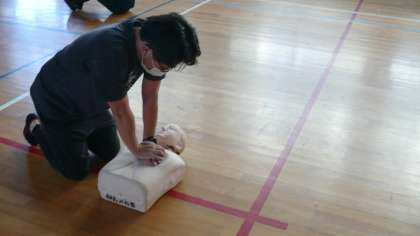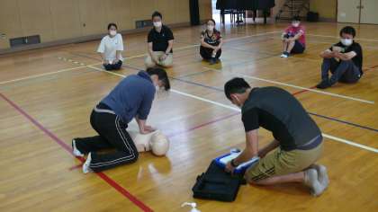 水泳指導の事前準備やマラソン、その他、学校生活での万が一に備えて、救急救命研修をしています。例年は、消防署から講師を招いて、じっくり研修をしますが、今年度は、自分たちで、研修をしています。年に1度、心肺蘇生法やAEDなど、思い出したり触れるだけでもいざという時の役にたつということで研修をしています。その他、不審者対応なども研修して、備えています。参考までに紹介させていただきました。