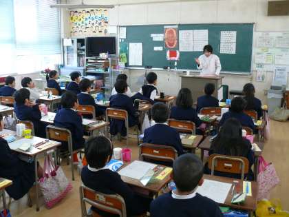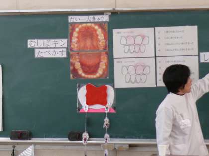 毎年、2年生で「歯磨き指導」を実施しています。歯科衛生士さんをゲストティーチャーに招いて、正しい歯磨きの仕方を学習します。