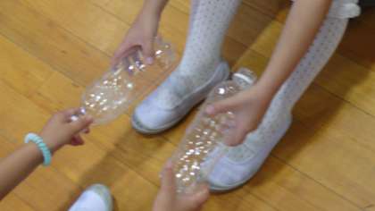 とはいえ、今年度は、コロナウイルスの関係で手をつなぐことができません。そこで、1年生が考えたのが、「朝顔の水やり」ペットボトルを活用しての手つなぎです。直接、手をつなぐことができないぼで、ペットボトルの端を持ち合って、手をつなぐようにしました。コロナウイルスの対策をしながら子どもたちに体を動かすようにしています。