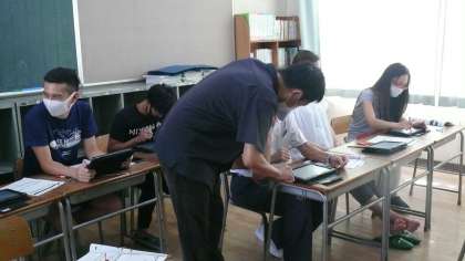 いよいよ本格的に、導入が待たれているリモートでの学習。今日は、教職員が実際に実行してみました。教職員が児童となり、アクセスをしたり会議に参加したり、画面上で意見交換したり、チャットをしたりと試してみました。