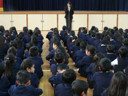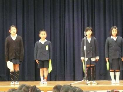 校長先生の話の後、2学期でがんばったことやできるようになったことなどを3年生代表の児童4名が発表しました。「遠足で行った海遊館が楽しかったです」「かけっこ速くなったね、と友だちに言われてうれしかったです」「二重とびが18回跳べました。練習してもっとうまくなりたいです」「運動会のソーラン節をがんばり、力強い動きができるようになりました」と話をしました。