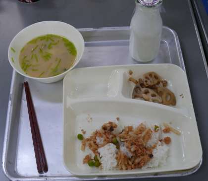 今日の給食は、「正月の行事献立」でした。「さけちらし」「ぞう煮」「焼きれんこん」のメニューでした。