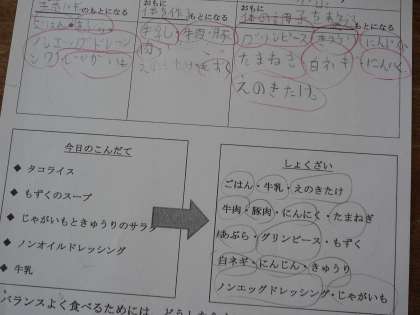 バランスよくたべることの大切さを今日の実際の給食を使ってわかりやすく教えていただきました。
