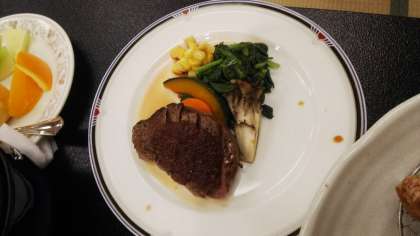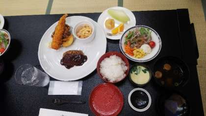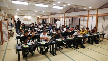 お待ちかねの夕食タイムです。例年と違って、一人一善。みんなお行儀よく、前を向いて食べます。