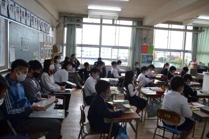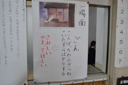ごんぎつねは何十年も前から国語の教科書に採用されている教材です。お家の方もきっと習ったのではないでしょうか。中心人物であるごんとそのほかの人物である兵十とのかかわりについて考え、感想を伝えあうという授業でした。教室には場面ごとのイラストと子どもたちが初めに書いた感想などが張り出されていていました。ワークシートも既存のものを使うのではなく子どもたちの実態に合わせて、担任の先生が作ったものを使っていました。子どもたちはたくさんの感想を書いていました。