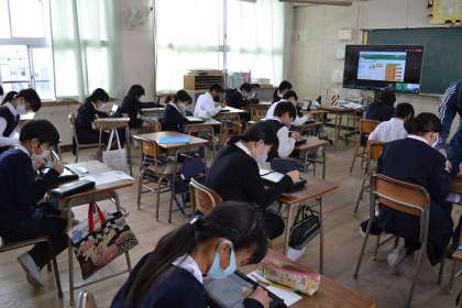 外部講師といっても小学校には来校せず、双方向通信チームズを使っての遠隔授業でした。画面からの指示に、子どもたちは驚きながらもしっかり対応していました。