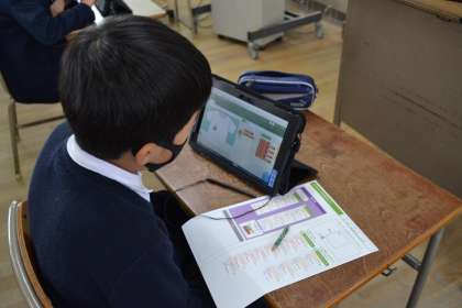 授業の最後には自分たちのオリジナルの図形をプログラミングを駆使して描いていました。論理的な思考が身に付くプログラミング学習。今後も計画的に進めていく予定です。