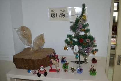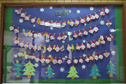 写真は1年生が図工の時間に作ったサンタクロースと、管理作業員が飾り付けしたクリスマスツリーです。できることは例年通り行い、季節を感じてもらえたらと言う気持ちが込められています。