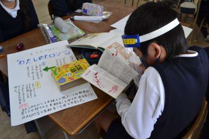 写真は6年生がフェイスシールドを付けて班活動している様子です。様々な制限がありますが、対策をすることがあたりまえになっている6年生、さすがですね。