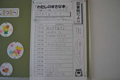 図書室の前を通ると、図書館補助員の方と図書委員の子どもたちが作ってくれた掲示物を見かけました。学年別の好きな本や、図書館の情報がたくさん載っていました。