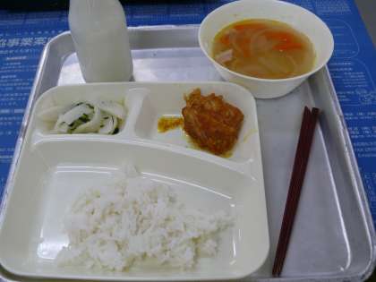今日の給食は、平成25年度の学校給食献立優秀賞の作品でした。「スープ」「タンドリーチキン」「だいこんサラダ」でした。