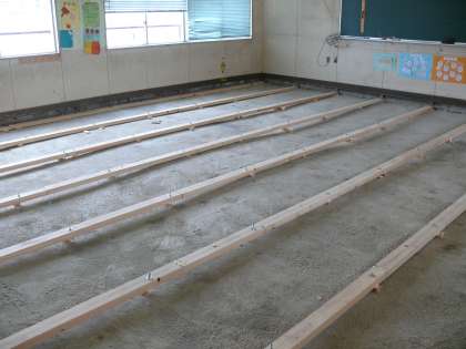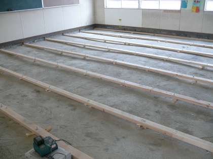 5,6年生の教室、床改修工事の途中経過です。現在、床下地組を組んでいます。