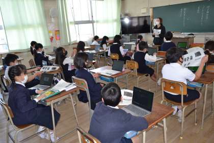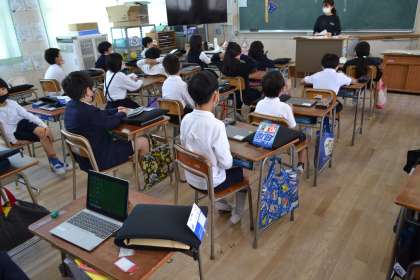 緊急事態宣言が発出されての学校の初日を迎えました。3時間目中に登校して、4時間目に2年生以上に一人一台端末を配りました。レノボ社製ノートパソコン(画面の部分とキーボードの部分がセパレートになっています。離して、タブレットとして使用できます。)と充電用のアダプターを持て帰りました。家で充電してください。ソフトケースにまとめて入れています。子どもたちはランドセルに入れて、大事そうに持って帰りました。
