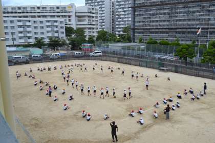 今日の5時間目、来月に迫った林間学習のキャンプファイアのスタンツの練習を5・6年生合同で運動場にて行いました。