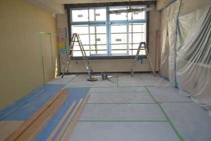 講堂に接する窓の取り換え工事(耐火サッシにするため)そのために図書室や音楽室が使えません。その他廊下なども同様です。