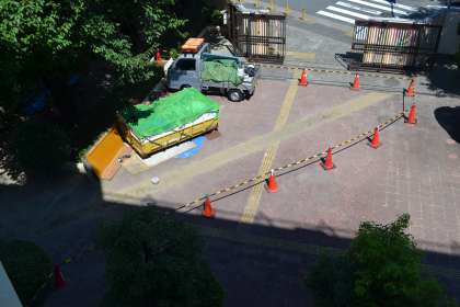 また、正門付近では、講堂にトイレ、シャワーが完備されることで、汚水処理のための配管工事なども行われています。講堂の建て替えが、様々な影響を与えていることに痛感しています。この夏休みを過ごして、校舎内は通常に戻りたいと願うばかりです。