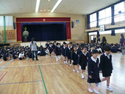今日は対面式。2〜6年の児童と1年生との初めての出会いの会です。みんなで「よろしくお願いします」とあいさつし、校歌を歌って歓迎しました。