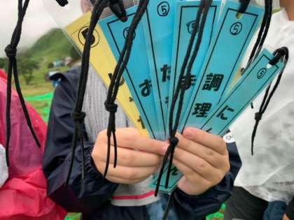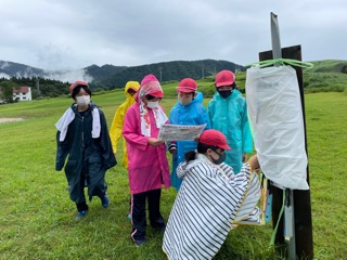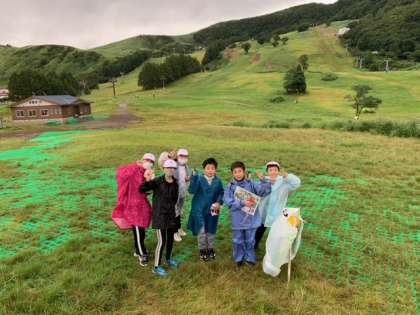 緑に覆われたスキー場を散策しています。草むらを歩いたり、山に向かって「ヤッホー」と叫んでやまびこ遊びをしたりして楽しんでいました。