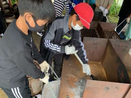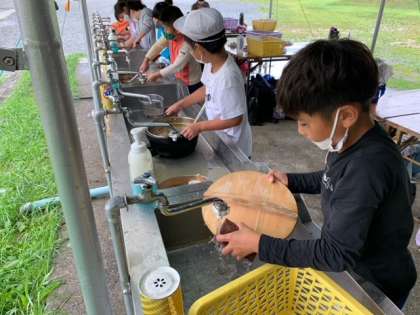 カレーを美味しくいただいた後は、後片付けです。「使う前より綺麗にしよう!」を合言葉に、丁寧に一つひとつ洗います。まきを使ったので、お鍋の底のすすは、なかなか取れないので力をこめてごしごしと洗いました。