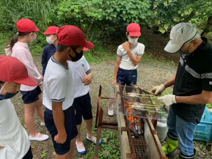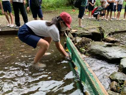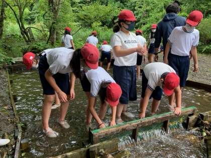 いよいよ楽しみにしていた魚つかみです。アマゴは渓流の女王と呼ばれる位美味しい魚です。子どもたちが接近し危険を感じるとすぐさま隅に逃げてしまいます。その習性を利用して両手でアマゴをすくい上げます。