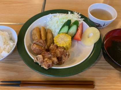 2日目の夕食メニューは、からあげ、サラダ、ポテト、パイン、ご飯、わかめスープです。