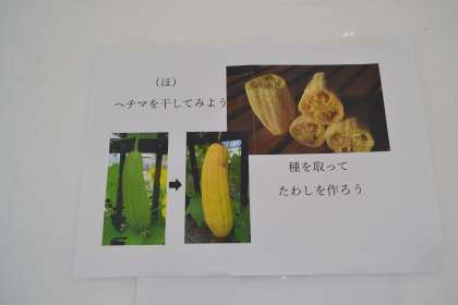 今後は、収穫したヘチマを教室前廊下で乾燥させた後、種を取り除いて、たわしを作る予定になっています。