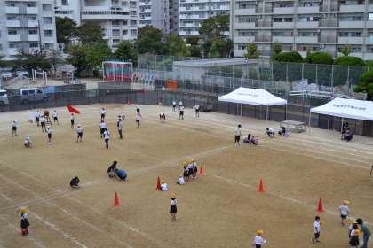 応援団が、運動場で練習したり本部用のテントが立ったり、運動場のトラックも正確にマークされて、団体演技の練習にも滅が入ってきました。