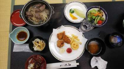 お待ちかねの夕食タイムです。今年のメニューは、伊勢うどん、けんちん汁、唐揚げ、サラダ、マグロどん、牛鍋、メロンです。