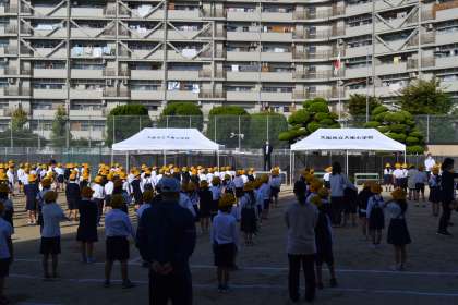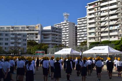 行進をするときは、縦横の列をしっかり揃え、腕をピンと伸ばし、足も高くあげて行進することでとてもかっこよくなること。さらに、あと1週間の練習を一生懸命頑張ることで素晴らしい運動会になることなどの激励がありました。